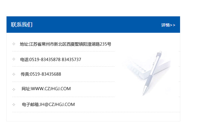 地址:常州市新北區友邦商務大廈1幢16、17層  電話:0519-85101652  傳真:0519-85112595  郵編:213022  網址:www.cz-jiayue_cn.massnjx.com  郵箱:xiajifengaa@163.com